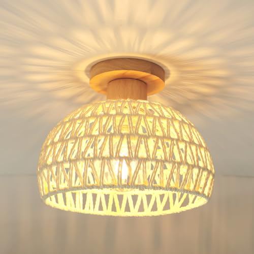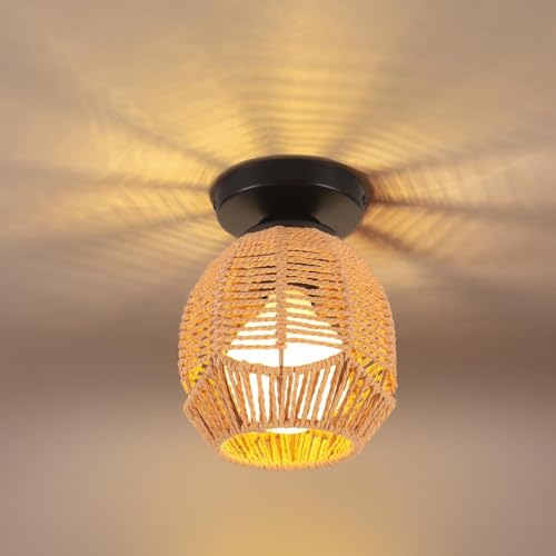 LIGINOK Plafonnier Vintage Bohème Lampe de Plafond Rétro avec Abat-jour en Rotin et Métal E27 Lustre Cage Éclairage Décoration Suspension Luminaire pour Chambre Entrée Couloir Cuisine,13.5cm