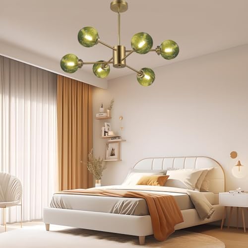 IDHBGJD Luminaire Suspendu Globe Transparent à 6 lumières, lustres en Verre à Bulles, plafonnier Moderne du Milieu du siècle, Lustre Vert nervuré, plafonnier en Laiton brossé