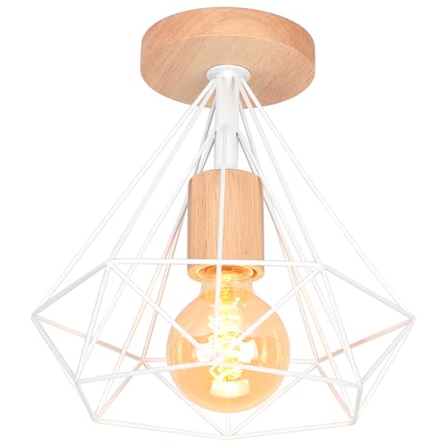 STOEX Plafonnier Vintage Industriel Design Bois et Métal Cage forme Diamant 25CM E27 LED Luminaire Eclairage pour Salon Cuisine Chambre Déco (Blanc avec bois)