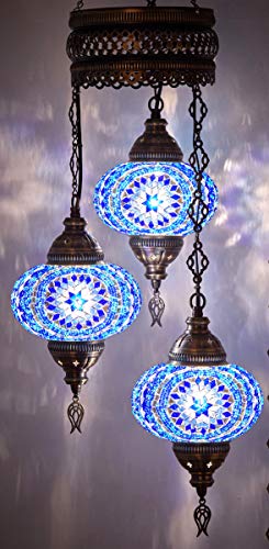 DEMMEX Lustre Turc en Verre Mosaïque – Suspension Orientale à 3 Boules, Verre Fait Main Ø18 cm, Luminaires Artisanaux pour Salon, Chambre ou Entrée (Bleu)