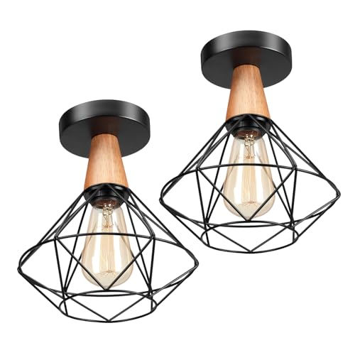 LIGKIN 2 Pièces Plafonnier Industriel, E27 Plafonnier Vintage en Métal Cage et Bois, Suspension Luminaire Rétro Design Chambre, Luminaires Intérieur Pour Salon, Chambre 22cm(Ampoule non Incluse)