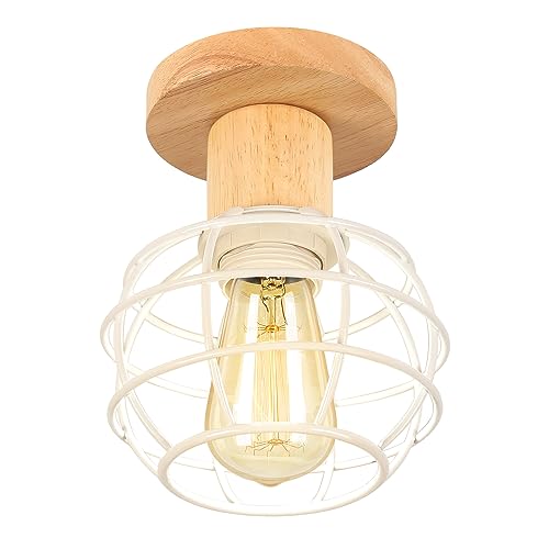LIGKIN Plafonnier Industriel, E27 Plafonnier Vintage en Métal Cage et Bois, Suspension Luminaire Rétro Design Chambre, Luminaires Intérieur Pour Salon, Chambre, 13cm(Blanc)