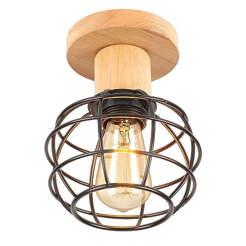 LIGKIN Plafonnier Industriel, E27 Plafonnier Vintage en Métal Cage et Bois, Suspension Luminaire Rétro Design Chambre, Luminaires Intérieur Pour Salon, Chambre, 13cm(Noir)
