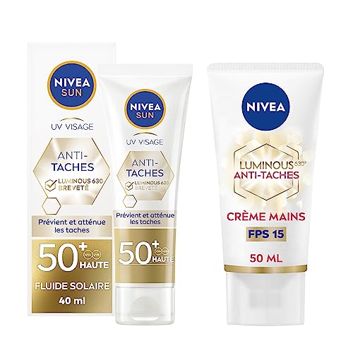 Lot NIVEA SUN Fluide UV visage anti-taches Luminous 630 FPS 50+ (1 x 40 ml), Protection solaire peaux sensibles + NIVEA Luminous 630® Crème pour les mains anti taches pigmentaires (1 x 50 ml),