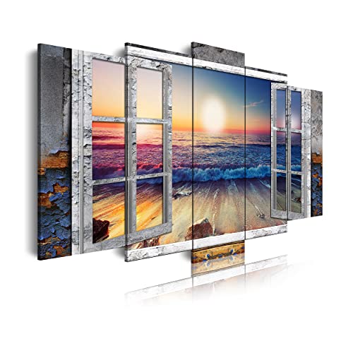 DekoArte - Impression Sur Toile Moderne | Toile Décorative Pour Votre Salon Ou Votre Chambre | Style Paysage Vue Sur La Plage au Coucher De Soleil depuis la Fenêtre | 5 Pièces 150 x 80 cm