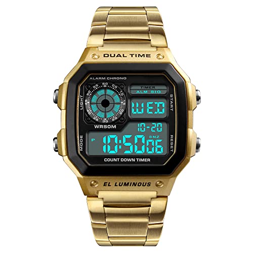 FeiWen Simple Homme et Femme Mode Montres Bracelet Plastique de la Lunette et Acier Inoxydable Ruban LED Digital Sport Outdoor Militaires 50M Étanche Multifonctionnel Montre (Doré)