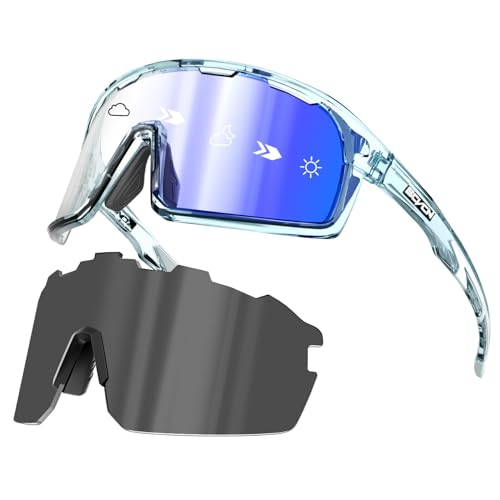 Odoland Lunettes de Cyclisme Photochromique pour Homme Femme Adulte Lunette de Velo Anti UV Lunette de Soleil Velo pour Randonneé Pêche Conduite, Bleu