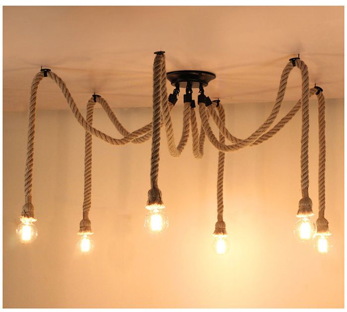WOTTES Rétro Lustre Suspension Araignee Corde de Chanvre avec 5 Bras E27 Douille Industriel Lampe DIY 2.0m Fil Longueur Ajustable