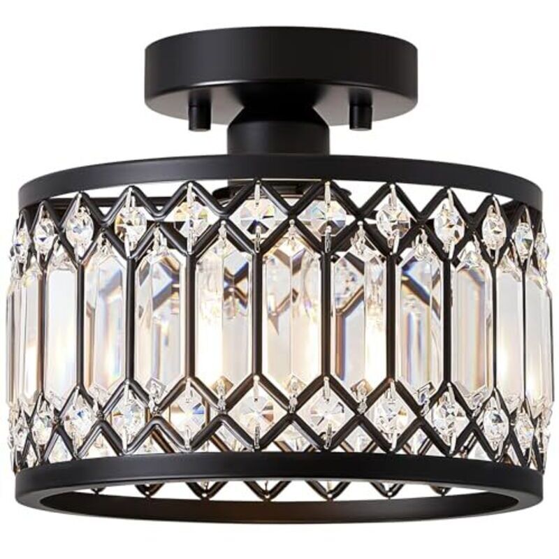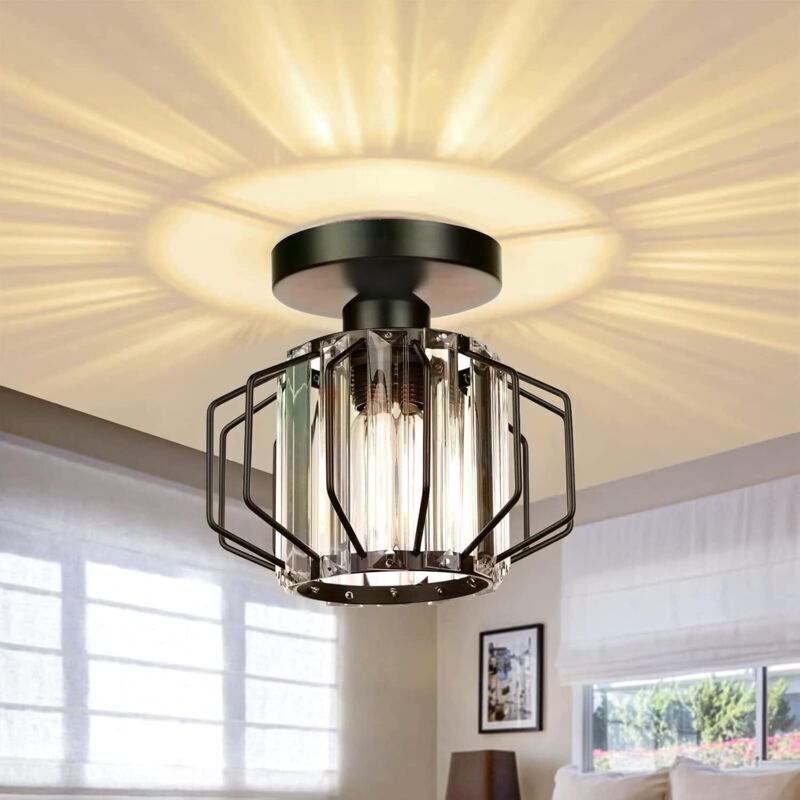 Goeco Plafonnier Cristal Moderne, E27 Mini Lustre en Cristal Métal Noir, Plafonnier Semi Encastré pour Cuisine Salle à Manger Couloir Porche Salon