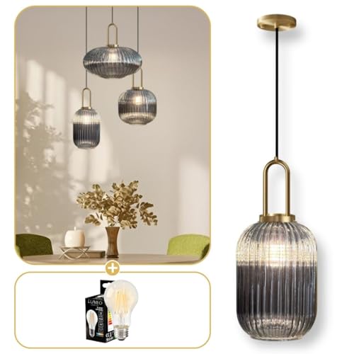 Lumeo creative | Suspension verre fumé Cristali | Lustre vintage pour salle à manger, ilot de cuisine, entree | suspension luminaire salon doré | Suspension vintage (Gris Intense, A - Poignée Anse)