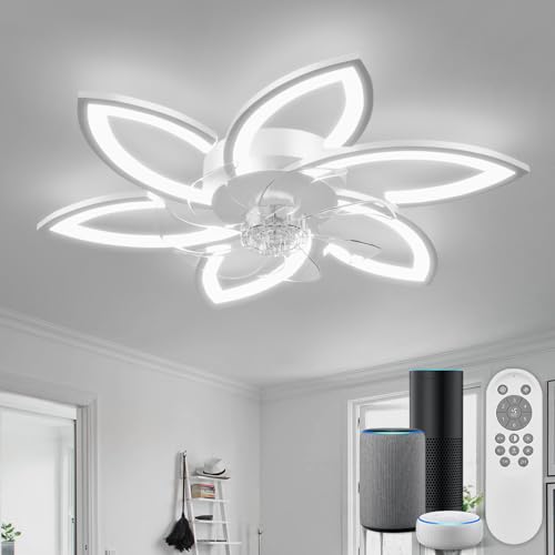 YUNLONG Lustre Ventilateur de Plafond Intelligent avec Télécommande et Commande Alexa, Aucun WiFi Requis, Luminaire Plafonnier Ventilateur, Design Floral Moderne, pour Chambre, Salon, Blanc