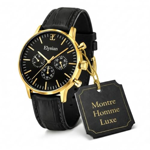Elysian Montre Homme Dorée | Boîtier en Acier Inoxydable 43mm avec Bracelet Cuir Crocodile | Mouvement Quarz Japonais Seiko VD34 | Verre Saphir | Étanchéité 5ATM | Boîte Cadeau Luxe | Garantie 2 Ans