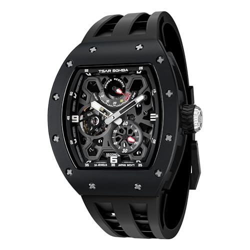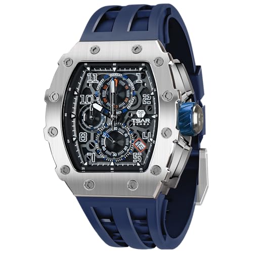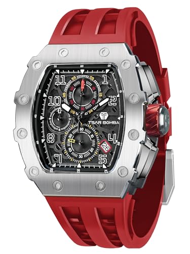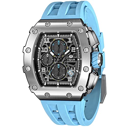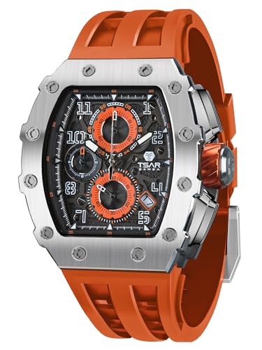 TSAR BOMBA Montre de Luxe Homme Etanche 50M Tonneau Analogique Chronometre Squelette Carrée Grand Cadran Plongee Sport Mouvement Japonais Bracelet Silicone Miroir Saphir Lumineux