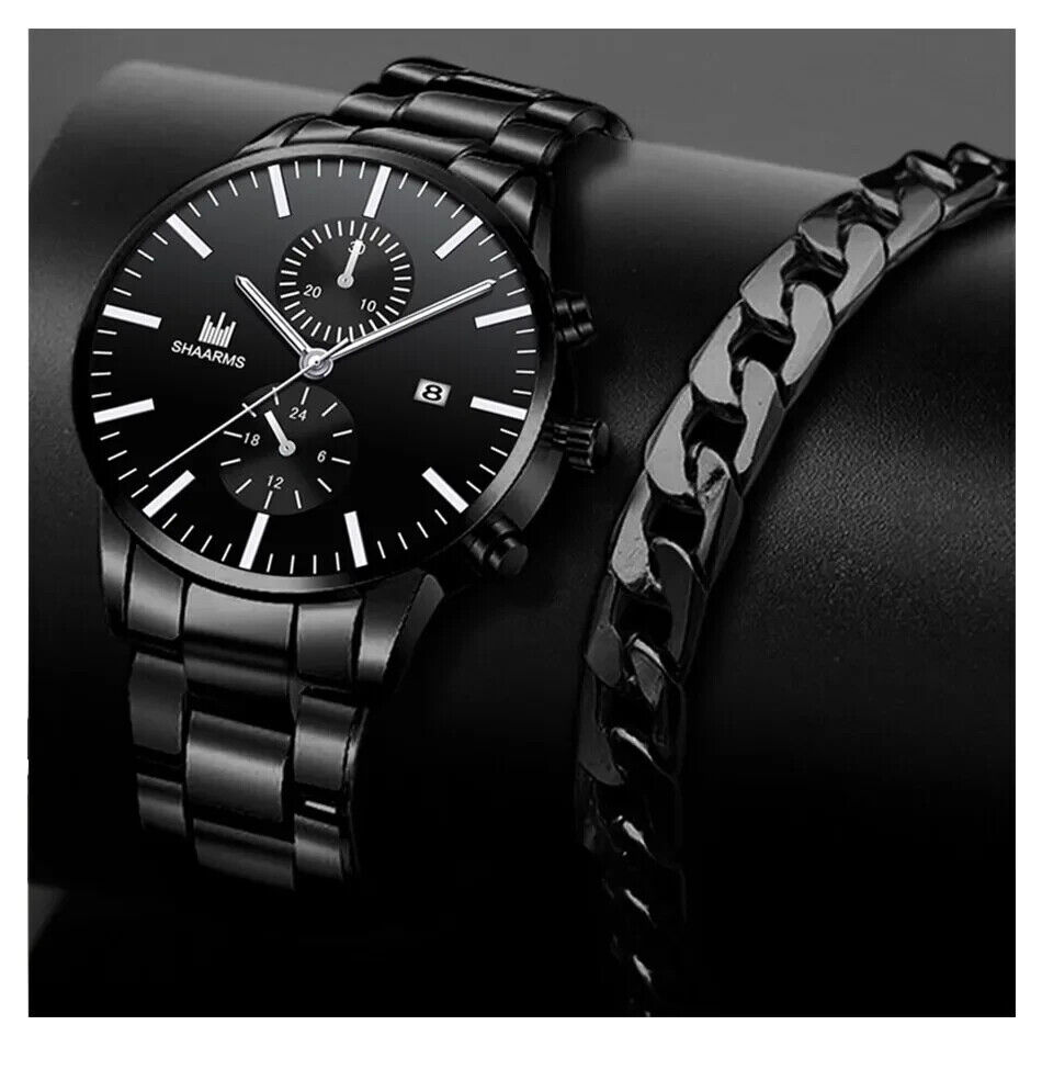 Ensemble 3 pcs Montre luxe Homme d'affaire noir or élégante et Magnifique