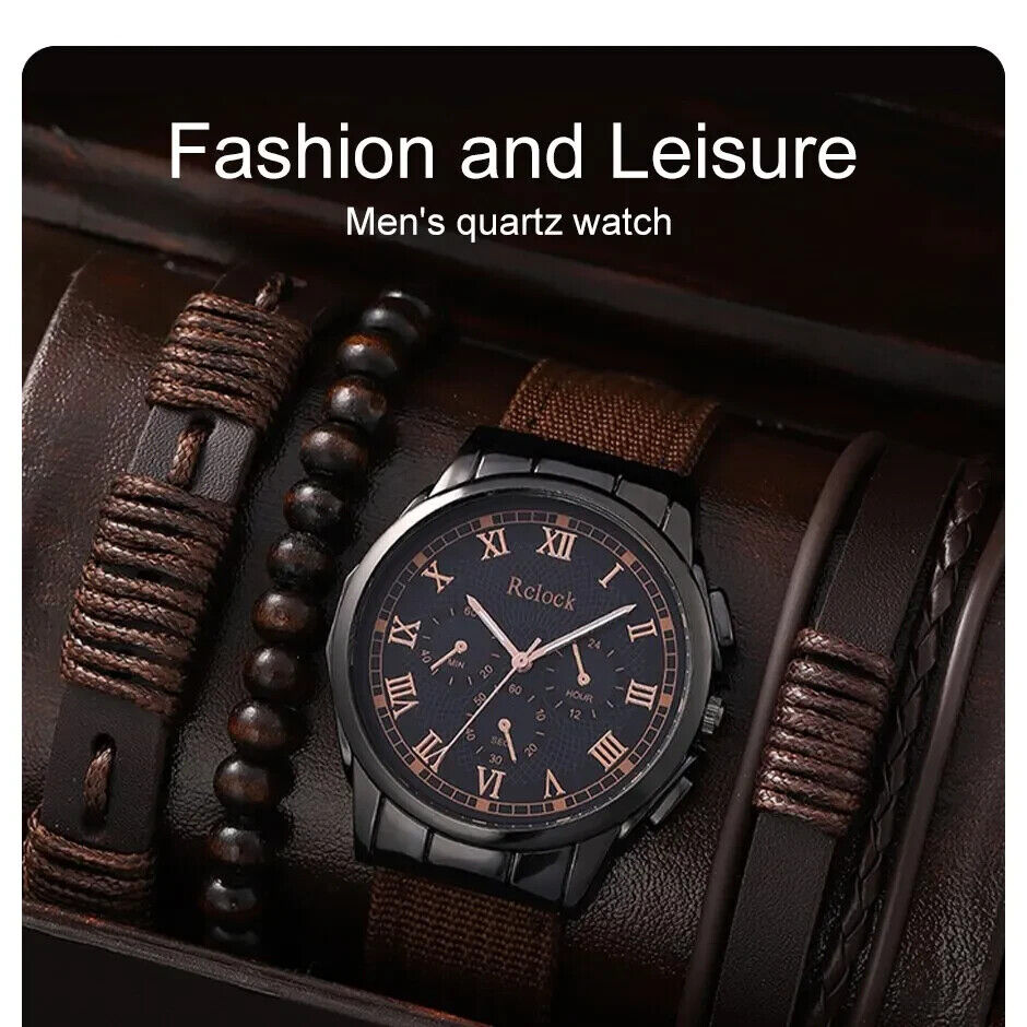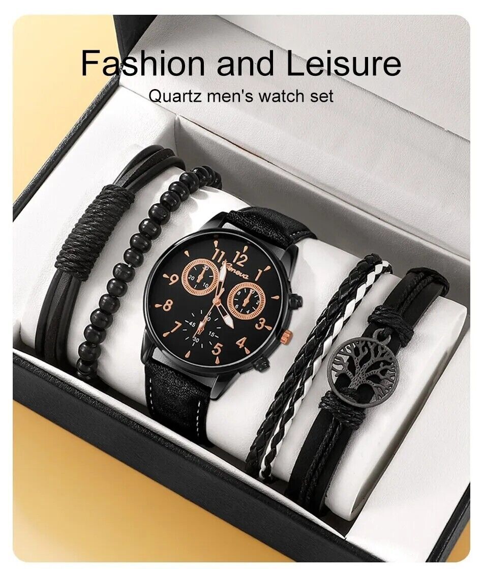 Ensemble 5 pcs Montre luxe Homme Militaire Noir sport cuir élégante et Magnifiqu