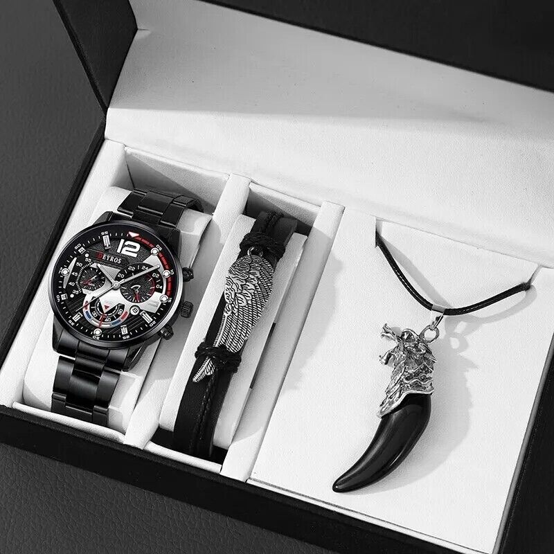 Ensemble 3 pcs Montre luxe Homme élégante Date Métal Or gourmette aigle