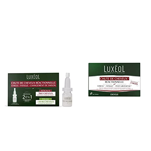 Luxéol – Chute de Cheveux Réactionnelle 2 en 1– Pousse & Antichute – 14 fioles de 7 ml & Pousse Croissance & Fortification 3 mois, Favorise la Pousse des Cheveux, 90 Gélules
