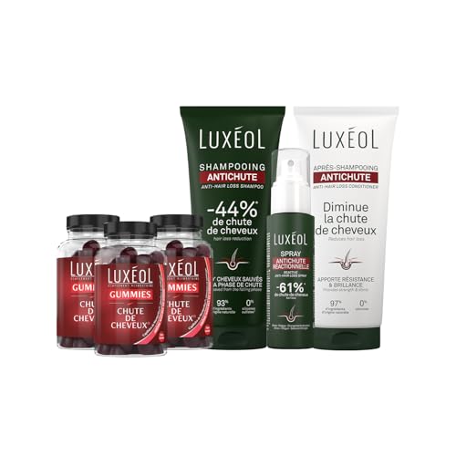 LUXEOL- Routine Gummies Anti-Chute In & Out- Gummies Chute de Cheveux + Shampooing & Après-Shampooing Anti-Chute + Spray Anti-Chute Réactionnelle- Aide à Réduire la Chute- Fabriqué en France