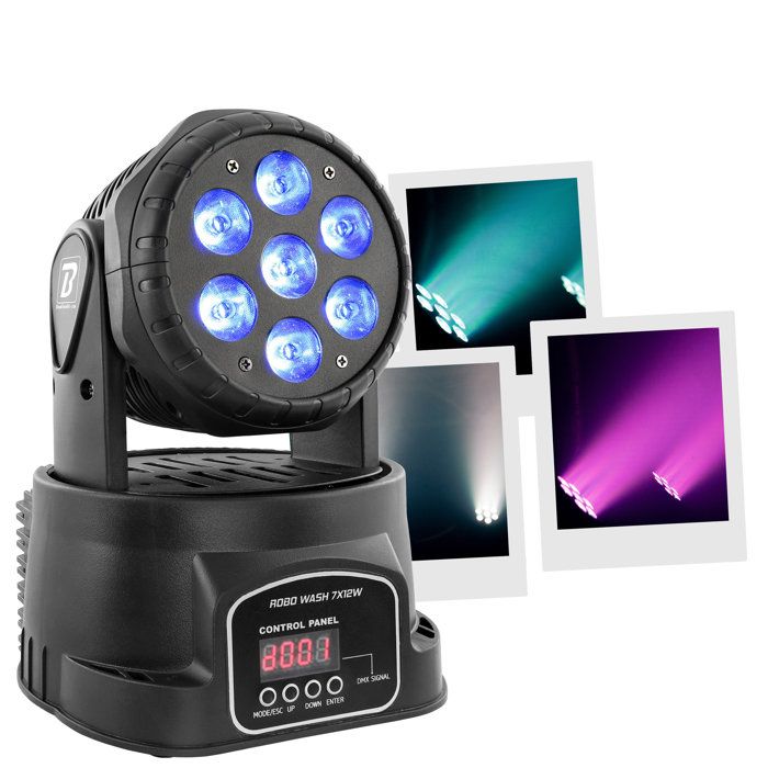 BoomToneDJ ROBO WASH 7X12W Lumière de scène LED RGBW 4in1, Dimmer, Stroboscope, Spot tête mobile, Lyre motorisée. Programmes automatiques, détection musicale, DMX, maitre/esclave.