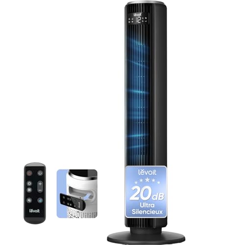 Levoit Ventilateur Colonne Silencieux 20 dB, Moteur DC, Refroidissement Puissant 7.9 m/s, 4 Modes 12 Vitesses, Mode Sommeil Avancé, Oscillation 90°, Télécommande, Minuterie 12 h, Noir, 92 cm