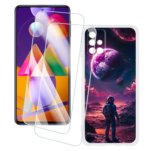 OAGELIM 2 Pack Protège-Écran + Coque Compatible avec Samsung Galaxy M31S (6.5 Pouce) Coque Impression Artistique Personnalisée et Film Verre Trempé (Astronaute)