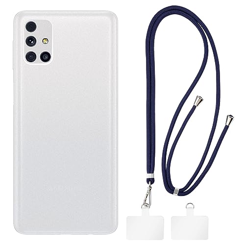 Shantime Coque et Lanière Bandoulière Compatible avec Samsung Galaxy M31S Coque de Téléphone et Sangle de Cou Réglable avec Boucles Métalliques et 2 Patchs(Blanc + Bleu)
