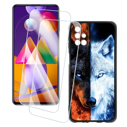 OAGELIM 2 Pack Protège-Écran + Coque Compatible avec Samsung Galaxy M31S (6.5 Pouce) Coque Impression Artistique Personnalisée et Film Verre Trempé (Loup)