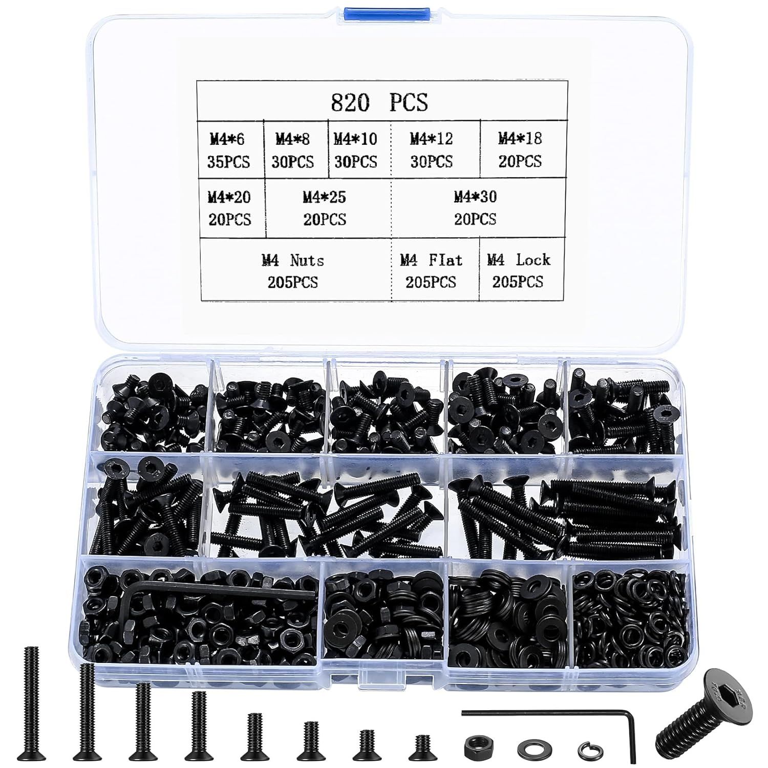 820 Pcs M4 Vis Boulons Et Écrous,Boulons Vis À Tête Fraisée,Vis À Six Pans Creux Hexagonale Assortiment Kit,Vis À Tête À Six Pans,Vis Boulons À Tête Plate De Fixations Pour Meubles Garage