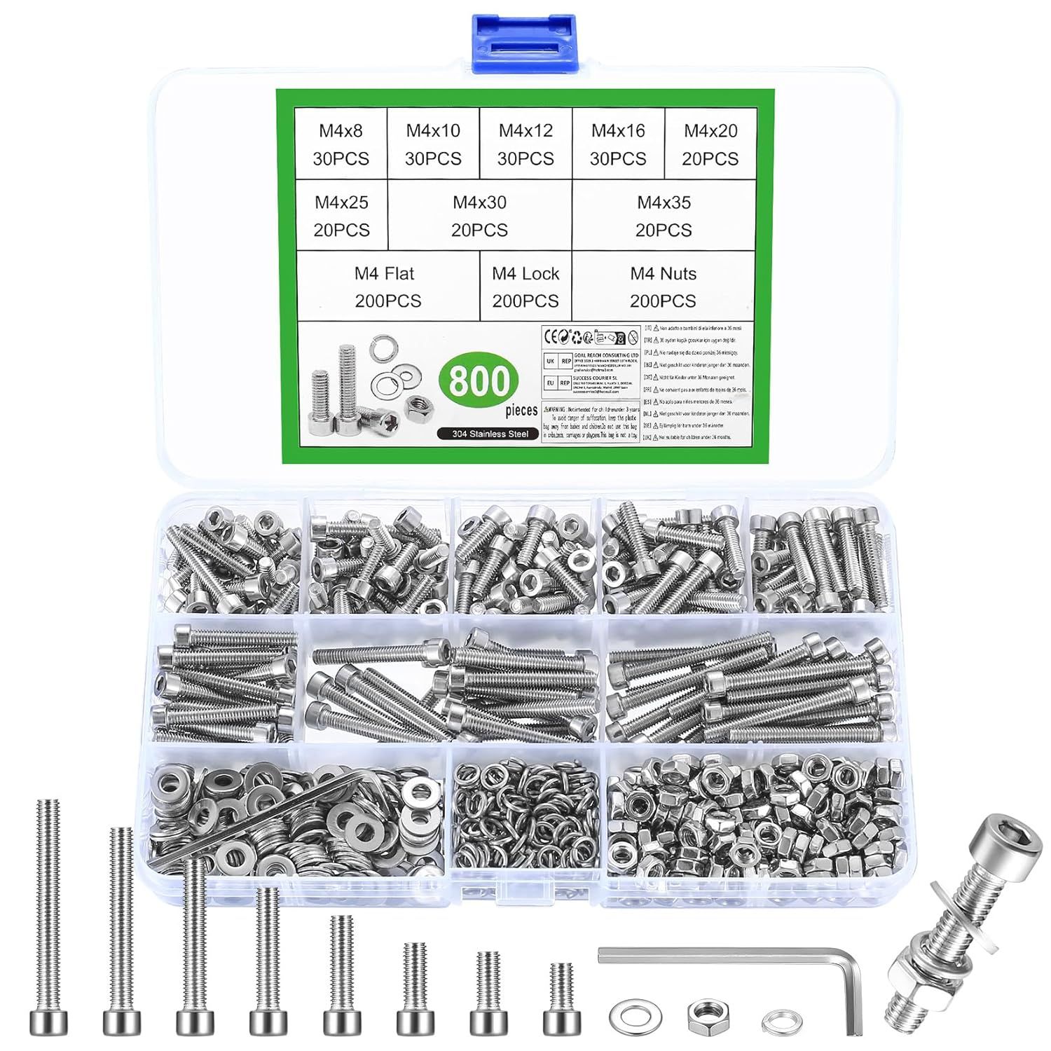MEVRONISSHOP-800 Pièces Set de Vis M4, Boulons Vis et écrous, Vis Boulons et écrous, Vis à Tête Cylindrique à Six Pans Creux en Acier Inoxydable, Vis Boulon et écrous et Rondelles Kit pour Réparation