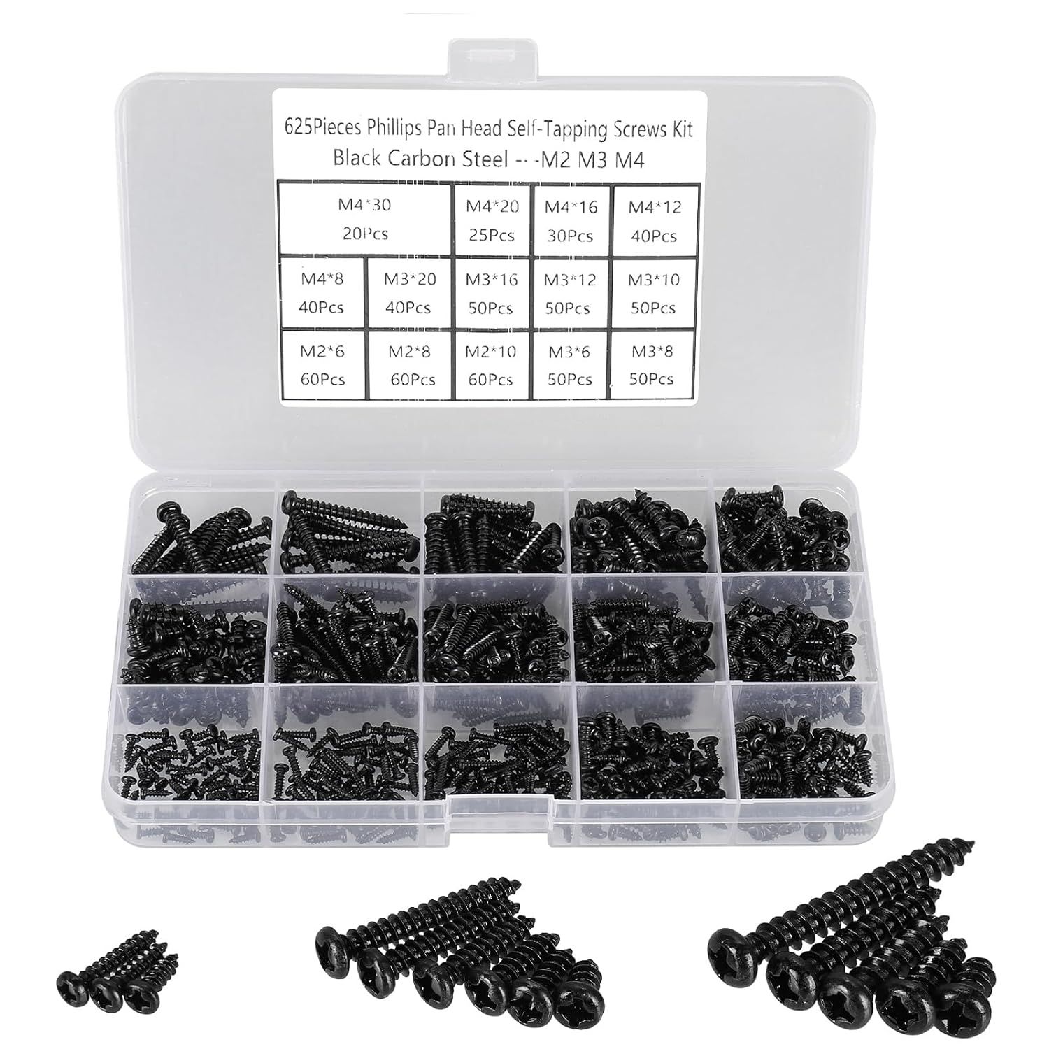 MEVRONISSHOP-625 Pièces Vis Autotaraudeuses,M2 M3 M4 Vis à Tête Cylindrique,Phillips Noir Tête Ronde Vis à Bois,Acier Carbone Vis Autoforeuse pour équipement de Bureau Meubles en Bois Devoirs DIY.