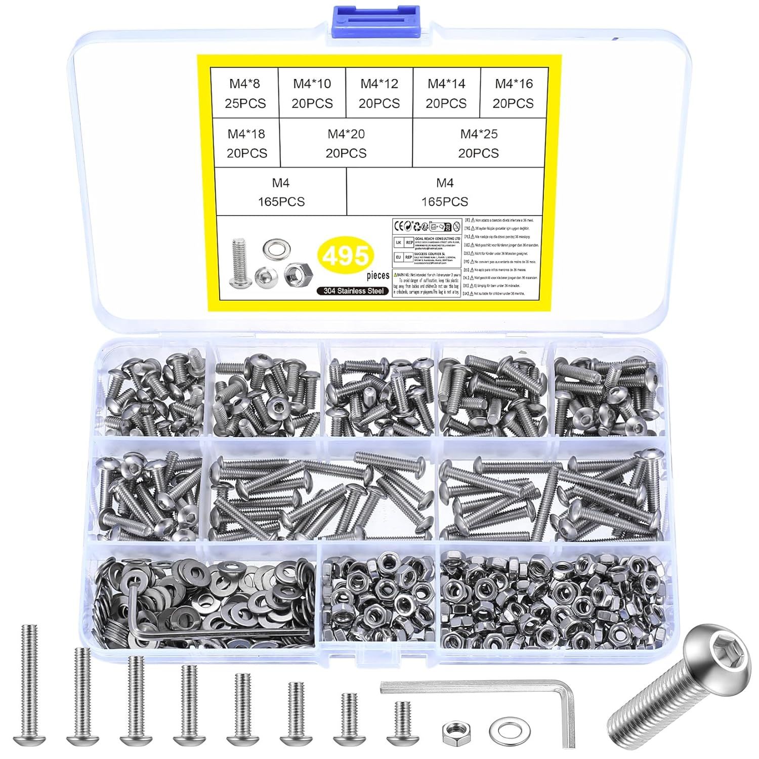 MEVRONISSHOP-495 Pièces Set de Vis M4, Vis Boulons et écrous et Rondelles, Boulons Vis à Tête Cylindrique à Six Pans Creux et écrous, Assortiment de Vis à Tête Ronde Allen, Vis Ecrous en Acier Inoxyd