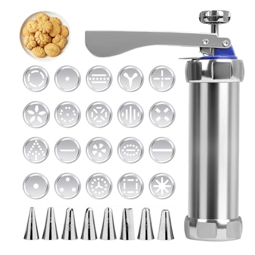 TELAOBAN Presse à Pâtisserie en Acier Inoxydable, avec 20 Gabarits et 8 Douilles, Pistolet à Patisserie, Presse à Biscuits, Presse à Biscuit pour décorer, Machine à Churros, pour Gâteaux Dessert