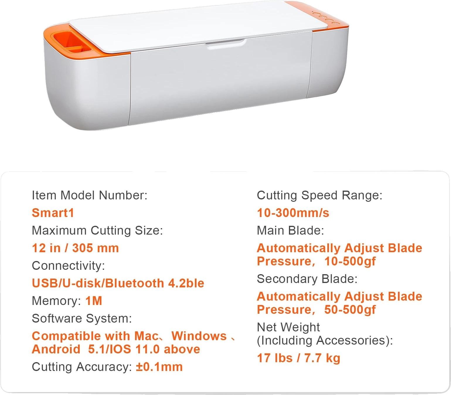 Machine de découpe vinyle, connectivité USB/Bluetooth, vitesse de découpe de 10-300 mm/s, taille de découpe de 12 pouces, Blanc Orange