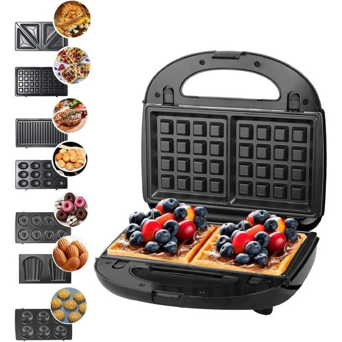 VINTEKY® Gaufrier Multifonction Croque Monsieur Machine à Sandwich Gaufrier 6 en 1 Grille de Contact 750W Noir