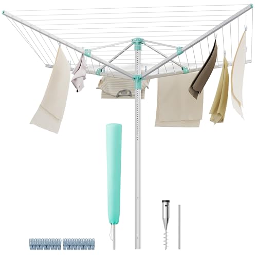 SONGMICS Étendoir à Linge, Séchoir, Réglable en Hauteur, Corde de 50 m, Jusqu’à 5 Machines de Linge, Extérieur, Jardin, avec Piquet de Sol, Pinces, Argent et Vert LLR301E01