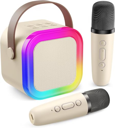 Machine à Karaoké avec 2 Microphone sans Fil pour Enfants par MMOBIEL – Enceinte Bluetooth Portable, 2 Microphone, Effets de Voix, Lumière LED – Micro Karaoke, Cadeau Fille, Garcon, Enfants 3+, Beige