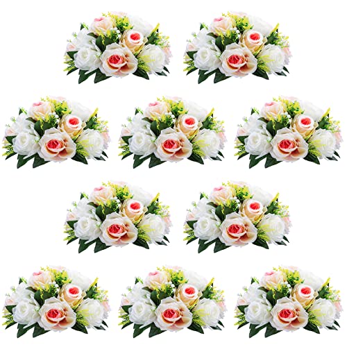 NUPTIO 10 Pièces Fleurs Artificielles, 15 Têtes de Roses Plastique avec Base, Convient au Centre de la Table Mariage Notre Magasin pour Les Fêtes Décoration de Saint Valentin(Champagne Rose&Blanc)