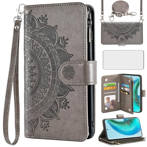 Asuwish Coque pour Honor Magic 6 Lite/X9b 5G Portefeuille avec Verre Trempé et Cordon Porte Carte Chaine PU Cuir à Clapet Protection Mandala Étui Housse Support Magic6 6Lite Téléphone Case Femme Gris