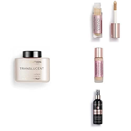 Makeup Revolution, Perfect Base Face Bundle, Conceal & Define C5 / F5 Concealer & Foundation, Translucent Loose Baking Powder and Glow Fixing Spray