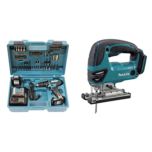 Makita HP333DSAX1 Perceuse-visseuse à percussion sans fil 12 V max. 2 Ah - 2 batteries + chargeur dans coffret de transport & DJV180Z Scie sauteuse sans fil 18 V Li-ion Boîtier nu