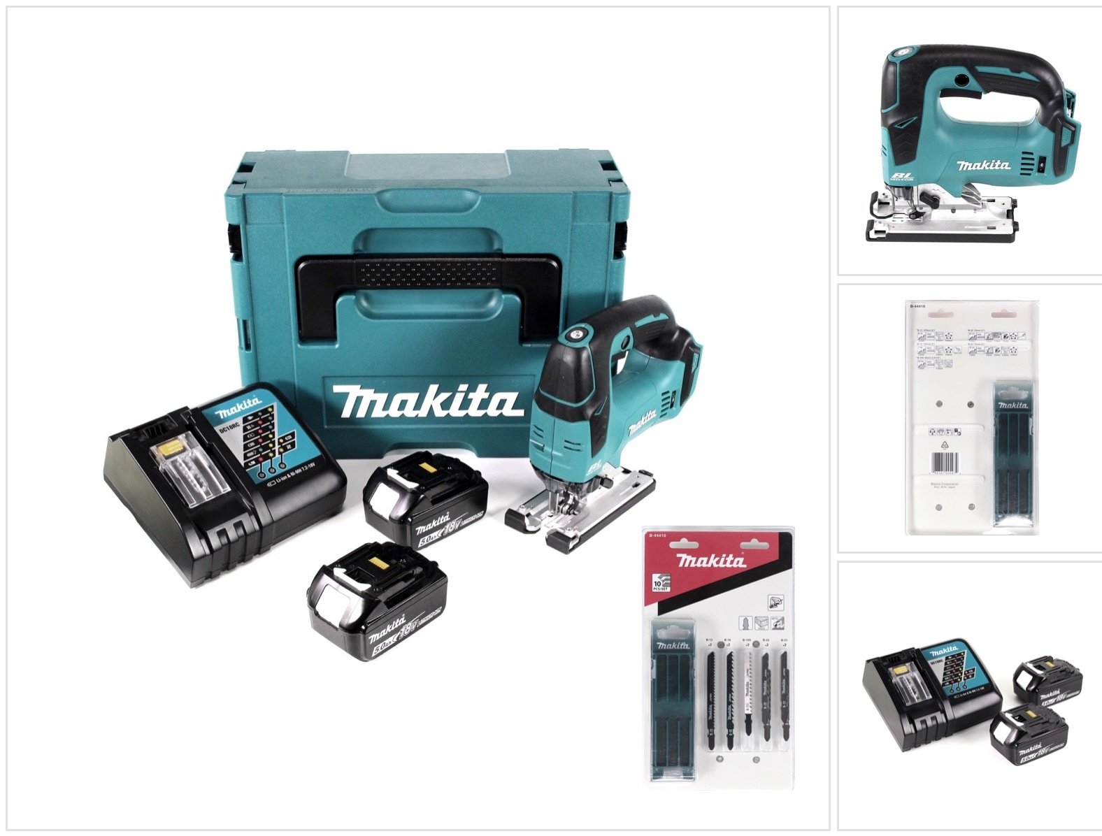 Makita DJV 182 RTJ Scie Sauteuse sans fil 18V Brushless 26mm + 2x Batteries BL1850B 5,0 Ah + Chargeur DC18RC + Coffret Makpac + Assortiment A de Lame de scie Makita ( B-44410 )