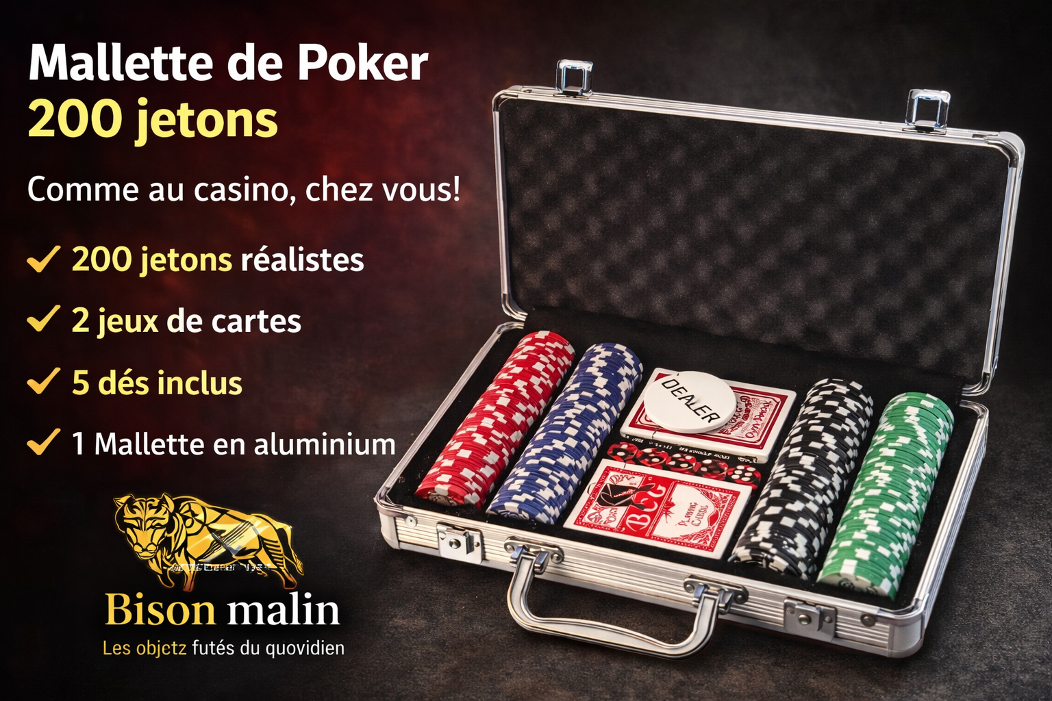🦬♠️ Mallette de Poker – Set Complet 200 Jetons – Ambiance Casino à la Maison🦬