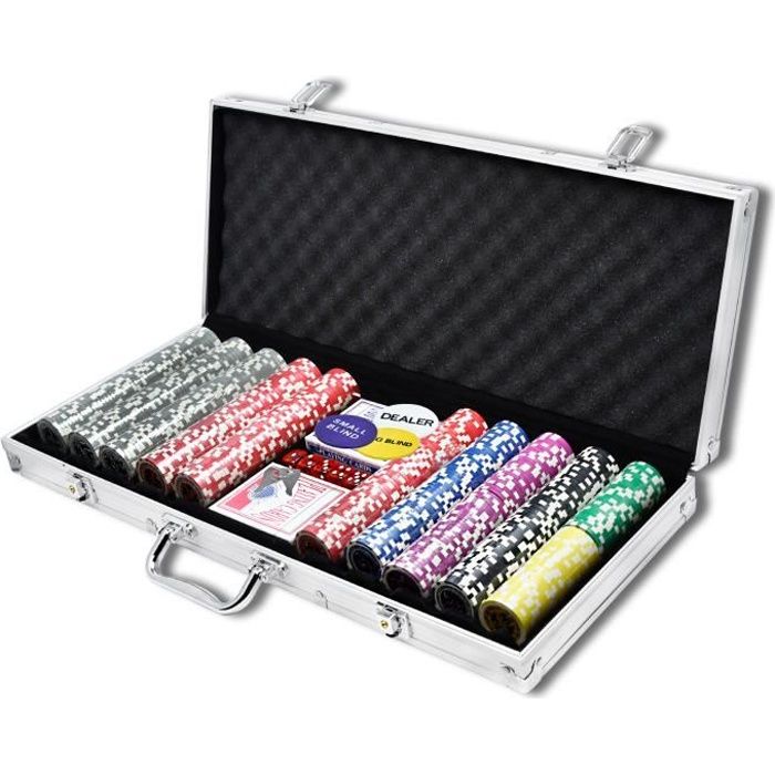 Coffret de poker - Malette métal argentée - 500 jetons 14g - 2 jeux de cartes - 5 dés - 3 boutons