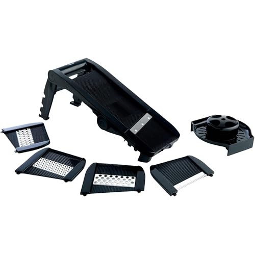 MASTRAD – Mandoline Multilames – 3 Râpes et 5 Lames Acier Inoxydable – Facile D’utilisation – Confort & Sécurité – 1 Poussoir – Coloris Noir
