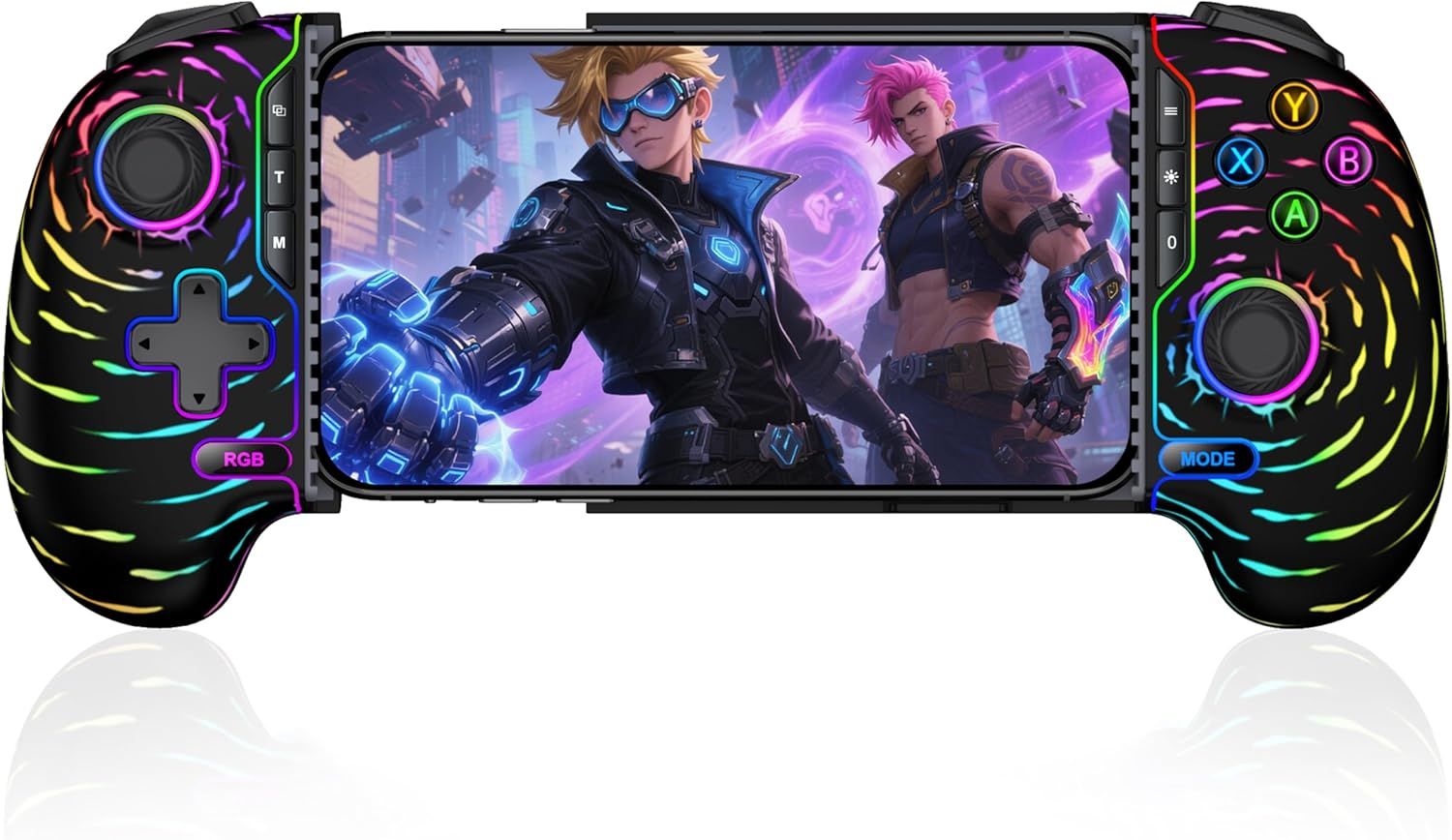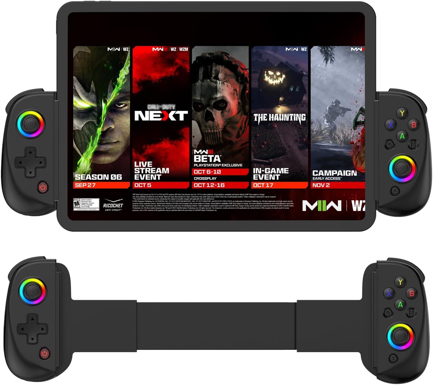 Manette de jeu pour iPad/Tablette, manette de jeu sans fil pour iPhone, manette télescopique Bluetooth RGB pour Android/iOS/PC/Smart Phones pour 13-25cm Parfait pour COD/Genshin, Direct Play (noir)