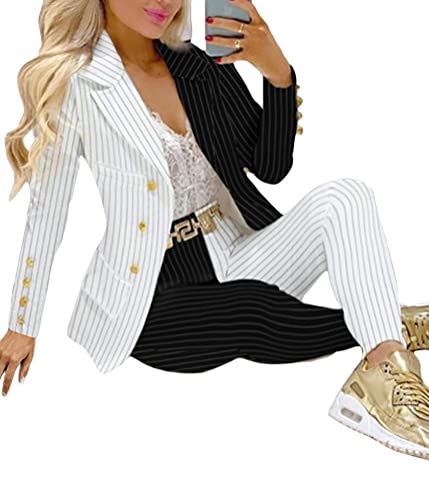 ORANDESIGNE Tailleur Femme 2 Pièces Elegant Slim Fit Blazer Veste Formel Bureau Travail Pantalon Costumes Revers Manteau Ensemble A Noir Blanc 02 L