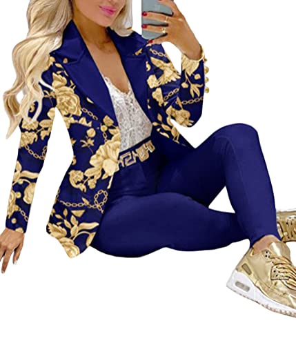 ORANDESIGNE Tailleur Femme 2 Pièces Elegant Slim Fit Blazer Veste Formel Bureau Travail Pantalon Costumes Revers Manteau Ensemble A Bleu L