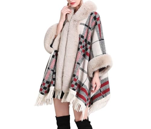 Cape Poncho à capuche pour femme en fausse fourrure,chaude,doublée en polaire,cape de Noël,écharpe,pompon à carreaux,pull châle,cardigan ouvert sur le devant, manteau de couverture pour femme auto