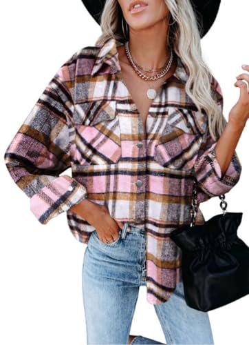 Rayson Chemise Femme Chic et élégant Bouton Down Veste Carreaux Femme Chaude Hiver Longue Manteau Flanelle (Rose, M)