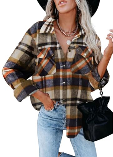 Rayson Chemise Femme Chic et élégant Bouton Down Veste Carreaux Femme Chaude Hiver Longue Manteau Flanelle(Orange, M)